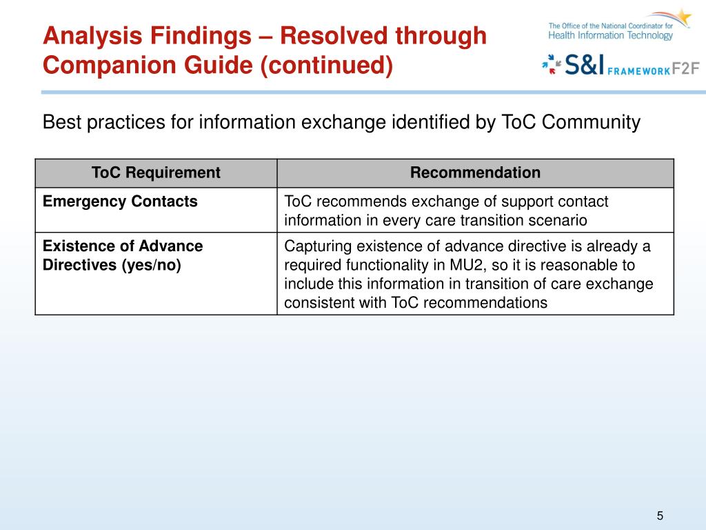 Analysis Findings – Resolved through Companion Guide (continued) Best practices for information exchange identified by ToC Community
