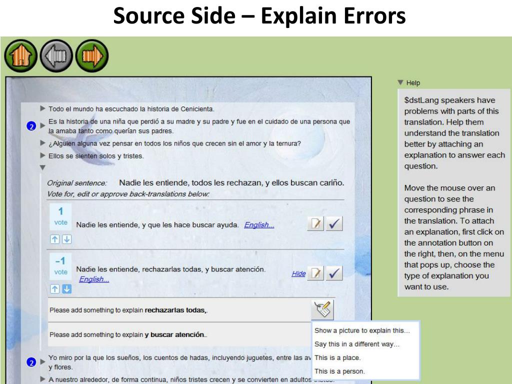 Source Language Target Language MT Translation Candidate Original Sentence Crowd Tasks: 1 1 Vote Vote MT and word alignment 2 3 Paraphrase source sentence Identify translation errors Crowd Tasks: 2 3 Explain errors Create new translation candidates MT and word alignment New candidate Explanation 1 … 2 3 repeat …
