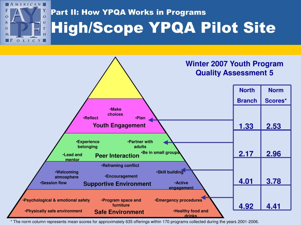 Make choices • Reflect • Plan Youth Engagement • Experience belonging • Partner with adults • Be in small groups • Lead and mentor Peer Interaction • Reframing conflict • Welcoming atmosphere • Skill building • Encouragement • Session flow Supportive Environment • Active engagement • Psychological & emotional safety • Program space and furniture • Emergency procedures • Physically safe environment Safe Environment • Healthy food and drinks Part II: How YPQA Works in ProgramsHigh/Scope YPQA Pilot Site Winter 2007 Youth Program Quality Assessment 5 North Branch Norm Scores* 1.33 2.53 2.17 2.96 4.01 3.78 4.92 4.41 * The norm column represents mean scores for approximately 635 offerings within 170 programs collected during the years 2001-2006.