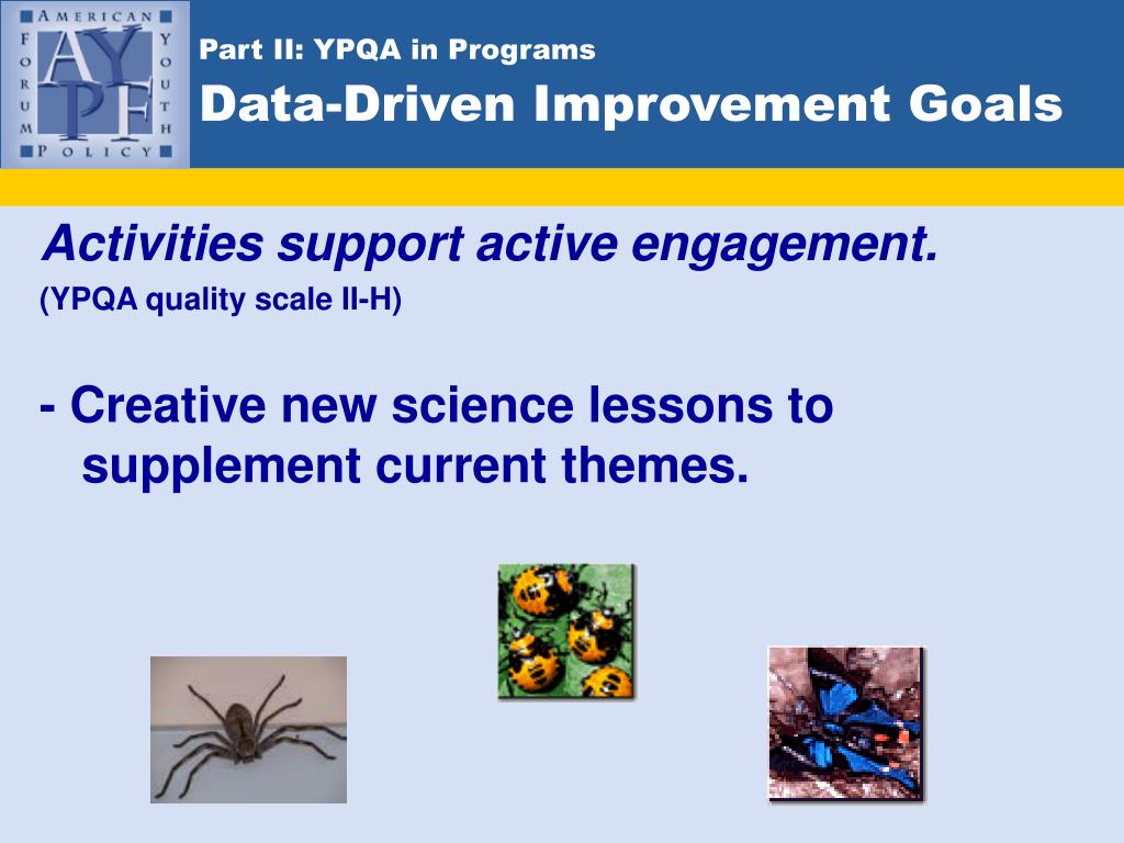 Part II: YPQA in ProgramsData-Driven Improvement Goals Activities support active engagement. (YPQA quality scale II-H) - Creative new science lessons to supplement current themes.