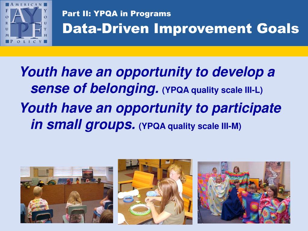 Part II: YPQA in ProgramsData-Driven Improvement Goals Youth have an opportunity to develop a sense of belonging. (YPQA quality scale III-L) Youth have an opportunity to participate in small groups. (YPQA quality scale III-M)
