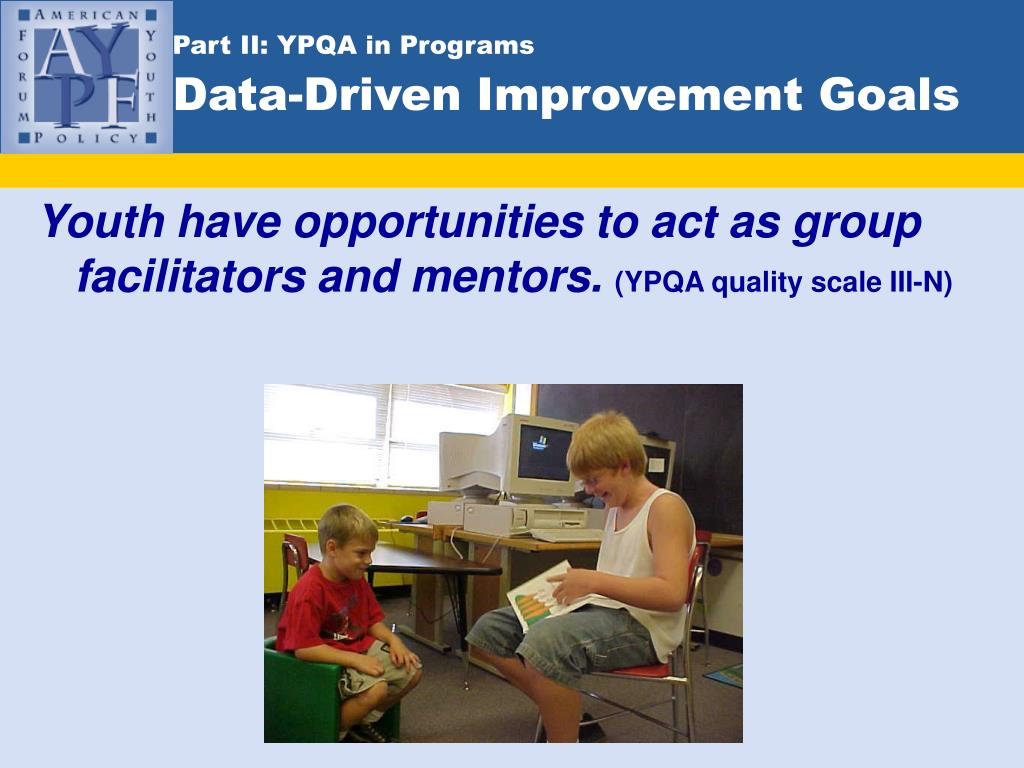 Part II: YPQA in ProgramsData-Driven Improvement Goals Youth have opportunities to act as group facilitators and mentors. (YPQA quality scale III-N)