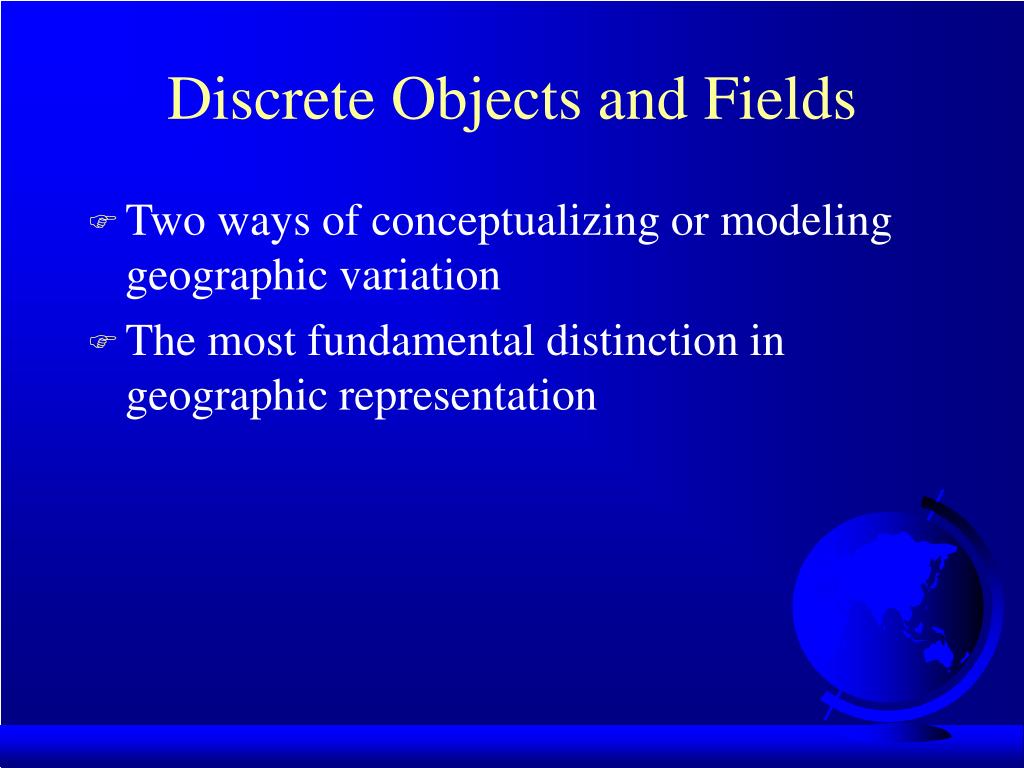 Discrete Objects and Fields • Two ways of conceptualizing or modeling geographic variation • The most fundamental distinction in geographic representation