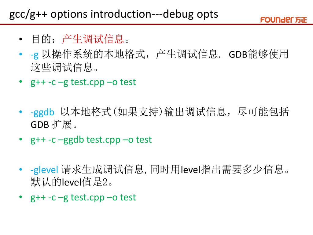 gcc/g++ options introduction---debug opts • 目的:产生调试信息。 • -g 以操作系统的本地格式,产生调试信息. GDB能够使用这些调试信息。 • g++ -c –g test.cpp –o test • -ggdb以本地格式(如果支持)输出调试信息,尽可能包括 GDB 扩展。 • g++ -c –ggdb test.cpp –o test • -glevel请求生成调试信息,同时用level指出需要多少信息。默认的level值是2。 • g++ -c –g test.cpp –o test