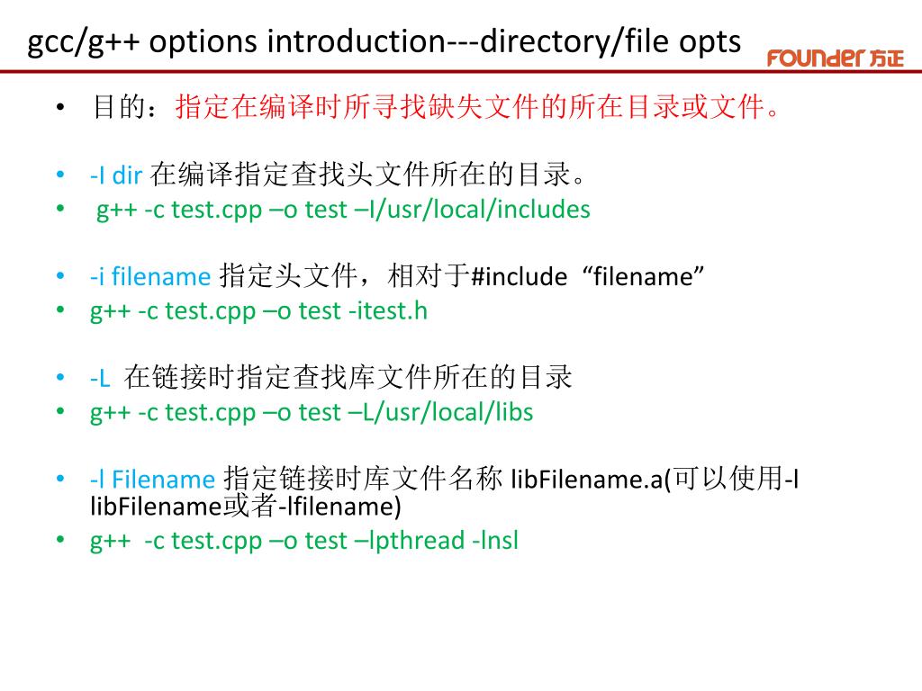 gcc/g++ options introduction---directory/file opts • 目的:指定在编译时所寻找缺失文件的所在目录或文件。 • -I dir 在编译指定查找头文件所在的目录。 • g++ -c test.cpp –o test –I/usr/local/includes • -i filename 指定头文件,相对于#include “filename” • g++ -c test.cpp –o test -itest.h • -L 在链接时指定查找库文件所在的目录 • g++ -c test.cpp –o test –L/usr/local/libs • -l Filename 指定链接时库文件名称 libFilename.a(可以使用-l libFilename或者-lfilename) • g++ -c test.cpp –o test –lpthread -lnsl