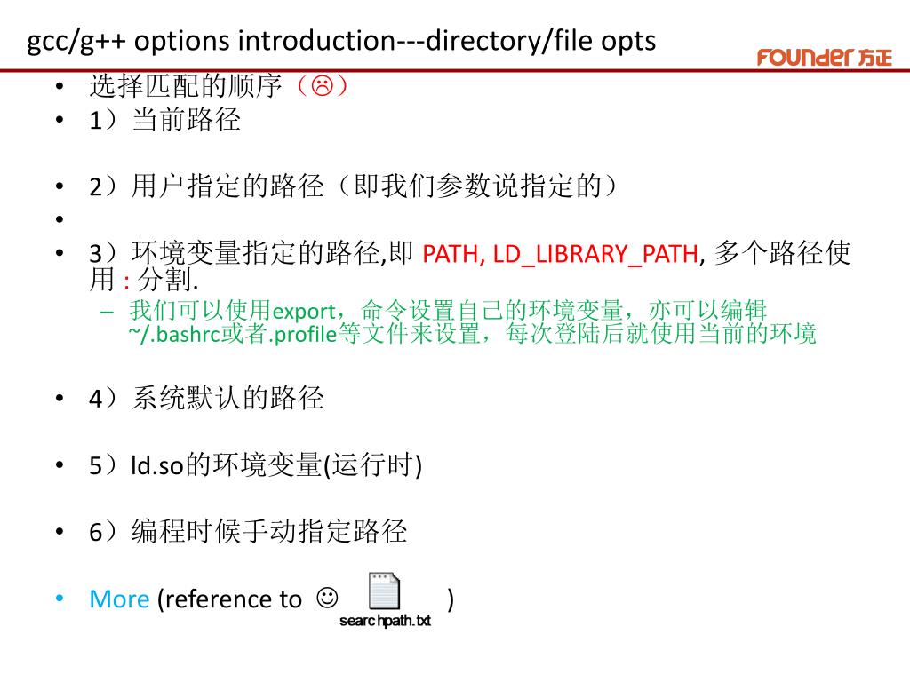 gcc/g++ options introduction---directory/file opts • 选择匹配的顺序() • 1)当前路径 • 2)用户指定的路径(即我们参数说指定的) • 3)环境变量指定的路径,即 PATH, LD_LIBRARY_PATH, 多个路径使用: 分割. • 我们可以使用export,命令设置自己的环境变量,亦可以编辑~/.bashrc或者.profile等文件来设置,每次登陆后就使用当前的环境 • 4)系统默认的路径 • 5)ld.so的环境变量(运行时) • 6)编程时候手动指定路径 • More (referenceto )