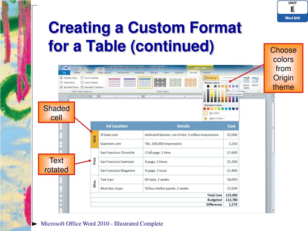 Creating a Custom Format for a Table (continued) Choose colors from Origin theme Shaded cell Text rotated Microsoft Office Word 2010 - Illustrated Complete