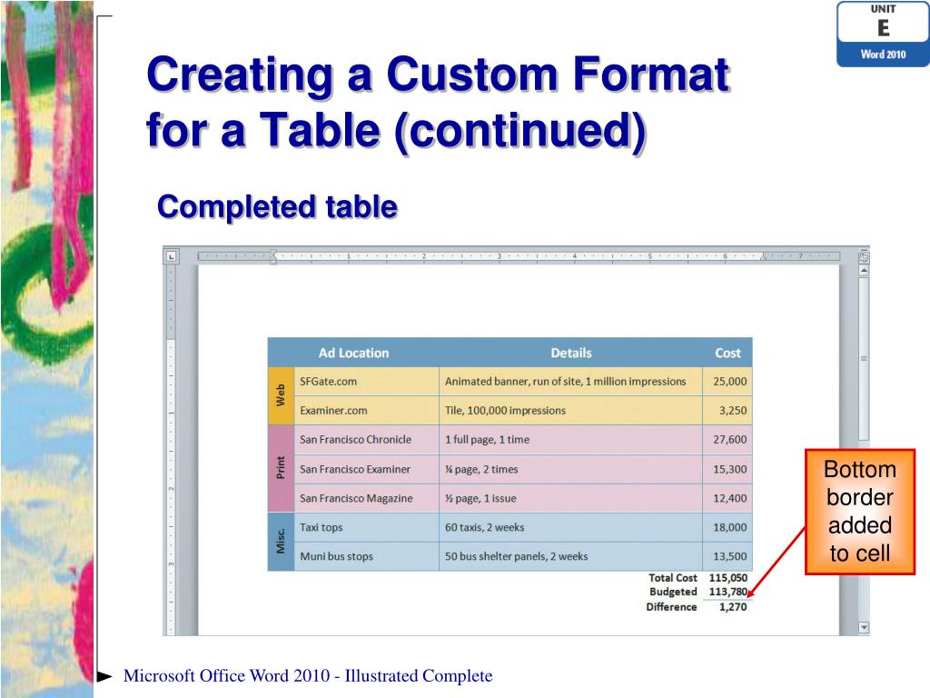Creating a Custom Format for a Table (continued) Completed table Bottom border added to cell Microsoft Office Word 2010 - Illustrated Complete