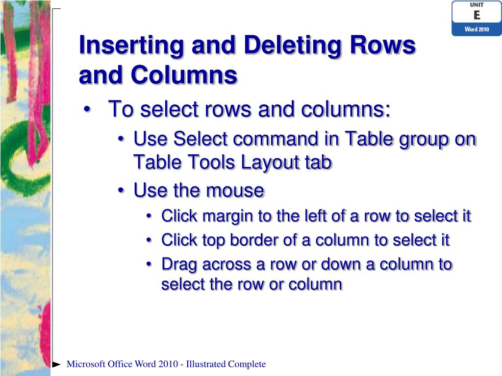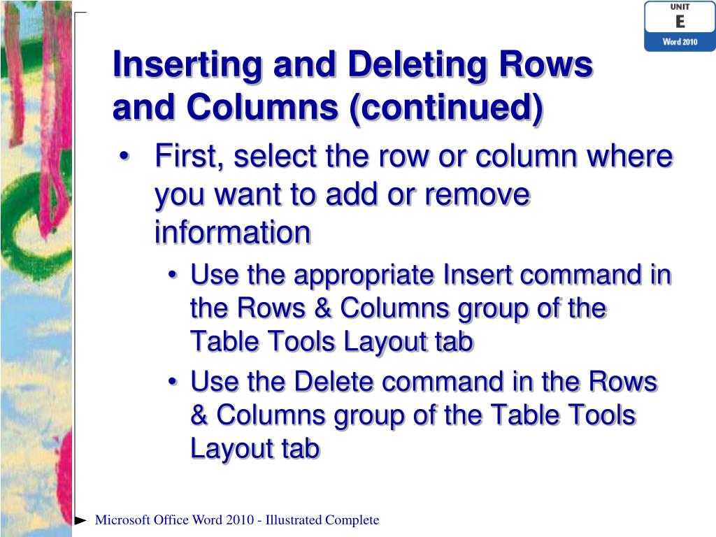 Inserting and Deleting Rows and Columns • To select rows and columns: • Use Select command in Table group on Table Tools Layout tab • Use the mouse • Click margin to the left of a row to select it • Click top border of a column to select it • Drag across a row or down a column to select the row or column Microsoft Office Word 2010 - Illustrated Complete