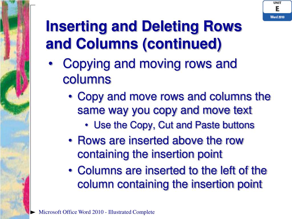 Inserting and Deleting Rows and Columns (continued) • Copying and moving rows and columns • Copy and move rows and columns the same way you copy and move text • Use the Copy, Cut and Paste buttons • Rows are inserted above the row containing the insertion point • Columns are inserted to the left of the column containing the insertion point Microsoft Office Word 2010 - Illustrated Complete