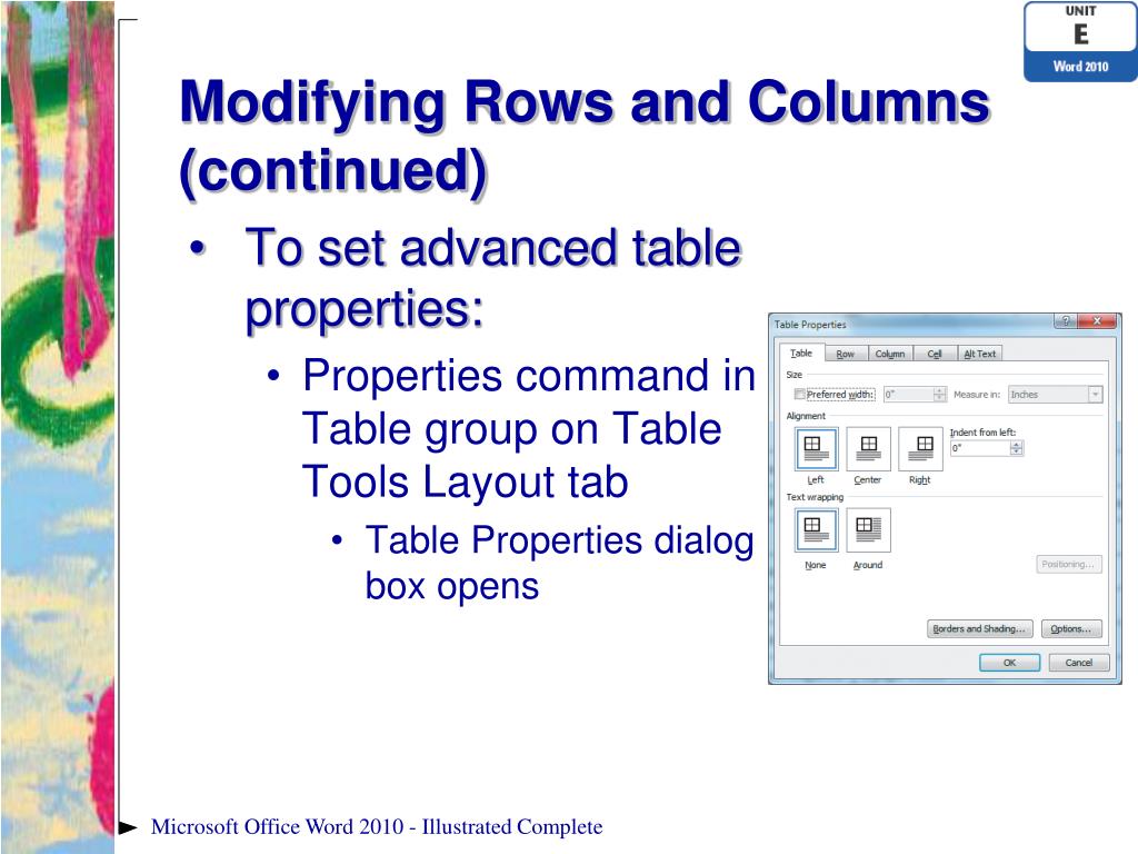 Modifying Rows and Columns (continued) • To set advanced table properties: • Properties command in Table group on Table Tools Layout tab • Table Properties dialog box opens Microsoft Office Word 2010 - Illustrated Complete
