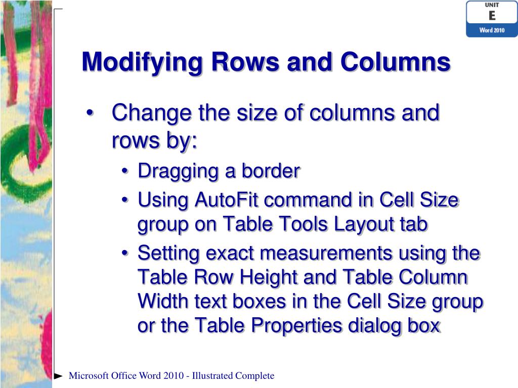 Modifying Rows and Columns • Change the size of columns and rows by: • Dragging a border • Using AutoFit command in Cell Size group on Table Tools Layout tab • Setting exact measurements using the Table Row Height and Table Column Width text boxes in the Cell Size group or the Table Properties dialog box Microsoft Office Word 2010 - Illustrated Complete