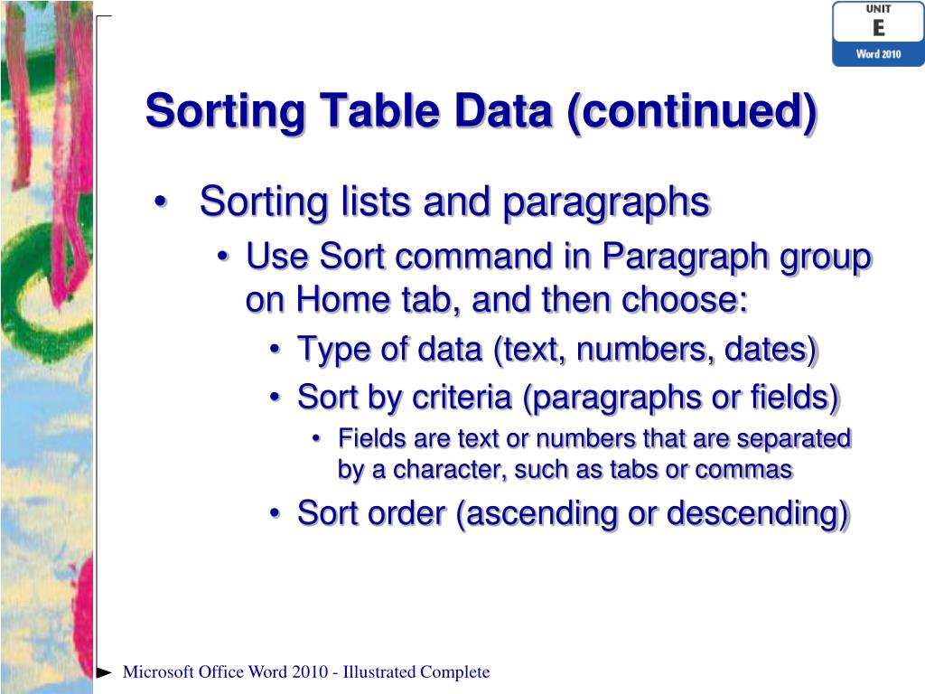 Sorting Table Data (continued) • Sorting lists and paragraphs • Use Sort command in Paragraph group on Home tab, and then choose: • Type of data (text, numbers, dates) • Sort by criteria (paragraphs or fields) • Fields are text or numbers that are separated by a character, such as tabs or commas • Sort order (ascending or descending) Microsoft Office Word 2010 - Illustrated Complete