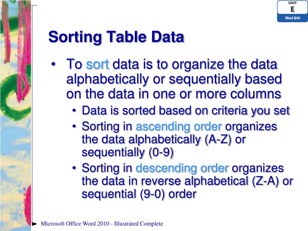 Sorting Table Data • To sort data is to organize the data alphabetically or sequentially based on the data in one or more columns • Data is sorted based on criteria you set • Sorting in ascending order organizes the data alphabetically (A-Z) or sequentially (0-9) • Sorting in descending order organizes the data in reverse alphabetical (Z-A) or sequential (9-0) order Microsoft Office Word 2010 - Illustrated Complete