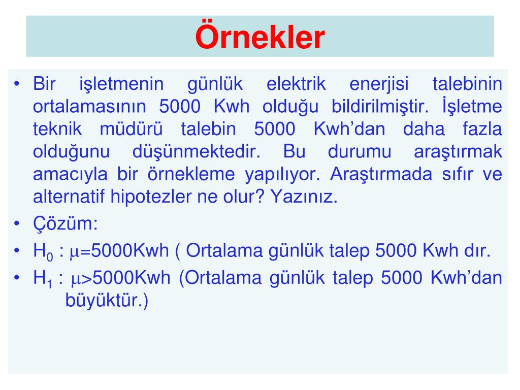 Örnekler Bir işletmenin günlük elektrik enerjisi talebinin ortalamasının 5000 Kwh olduğu bildirilmiştir. İşletme teknik müdürü talebin 5000 Kwh’dan daha fazla olduğunu düşünmektedir. Bu durumu araştırmak amacıyla bir örnekleme yapılıyor. Araştırmada sıfır ve alternatif hipotezler ne olur? Yazınız. Çözüm: H0 : =5000Kwh ( Ortalama günlük talep 5000 Kwh dır. H1 : >5000Kwh (Ortalama günlük talep 5000 Kwh’dan büyüktür.)