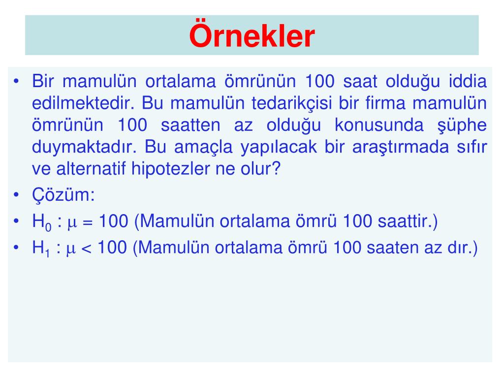 Örnekler Bir mamulün ortalama ömrünün 100 saat olduğu iddia edilmektedir. Bu mamulün tedarikçisi bir firma mamulün ömrünün 100 saatten az olduğu konusunda şüphe duymaktadır. Bu amaçla yapılacak bir araştırmada sıfır ve alternatif hipotezler ne olur? Çözüm: H0 : = 100 (Mamulün ortalama ömrü 100 saattir.) H1 : < 100 (Mamulün ortalama ömrü 100 saaten az dır.)