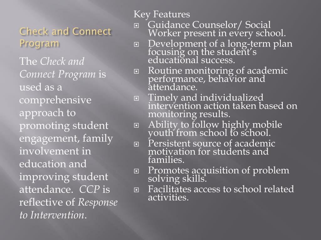 Check and Connect Program Key Features • Guidance Counselor/ Social Worker present in every school. • Development of a long-term plan focusing on the student’s educational success. • Routine monitoring of academic performance, behavior and attendance. • Timely and individualized intervention action taken based on monitoring results. • Ability to follow highly mobile youth from school to school. • Persistent source of academic motivation for students and families. • Promotes acquisition of problem solving skills. • Facilitates access to school related activities. The Check and Connect Program is used as a comprehensive approach to promoting student engagement, family involvement in education and improving student attendance. CCP is reflective of Response to Intervention.
