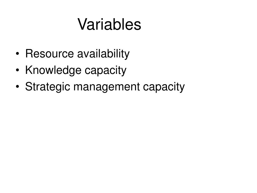 Variables • Resource availability • Knowledge capacity • Strategic management capacity