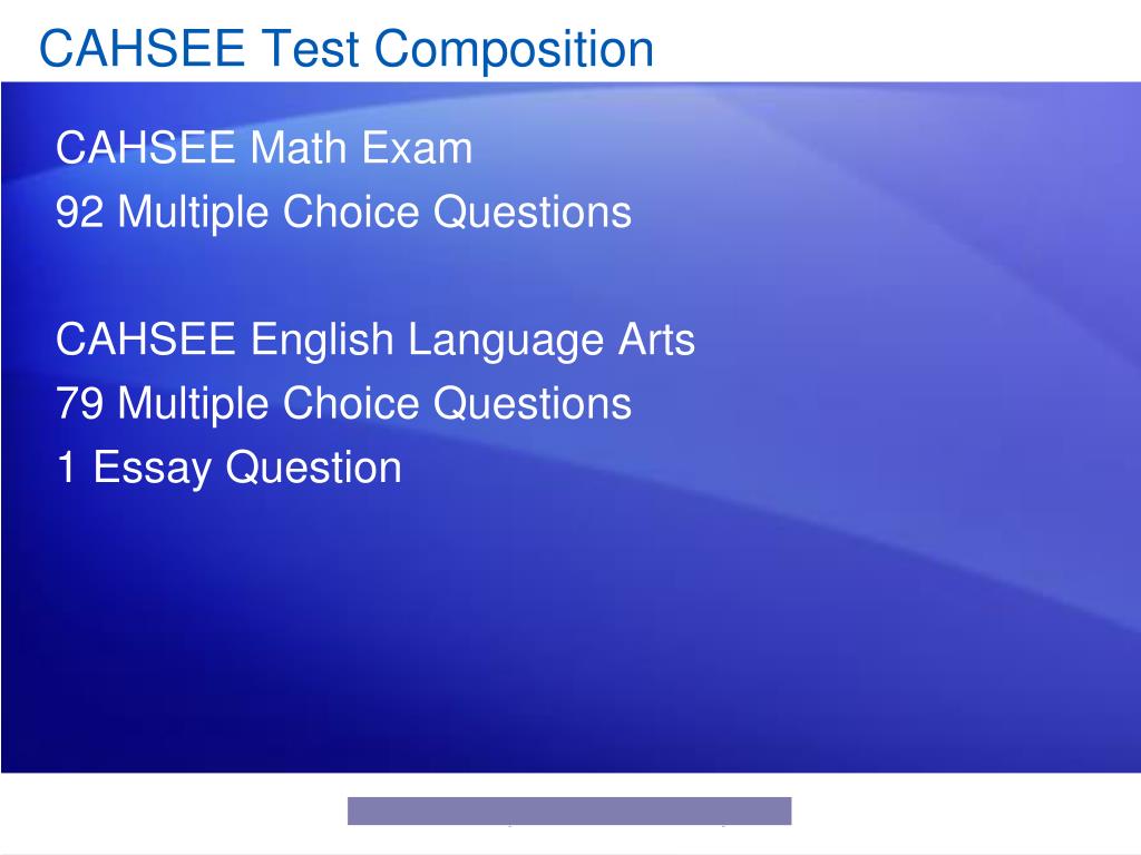 CAHSEE Test Composition • CAHSEE Math Exam • 92 Multiple Choice Questions • CAHSEE English Language Arts • 79 Multiple Choice Questions • 1 Essay Question Discover the power of custom layouts