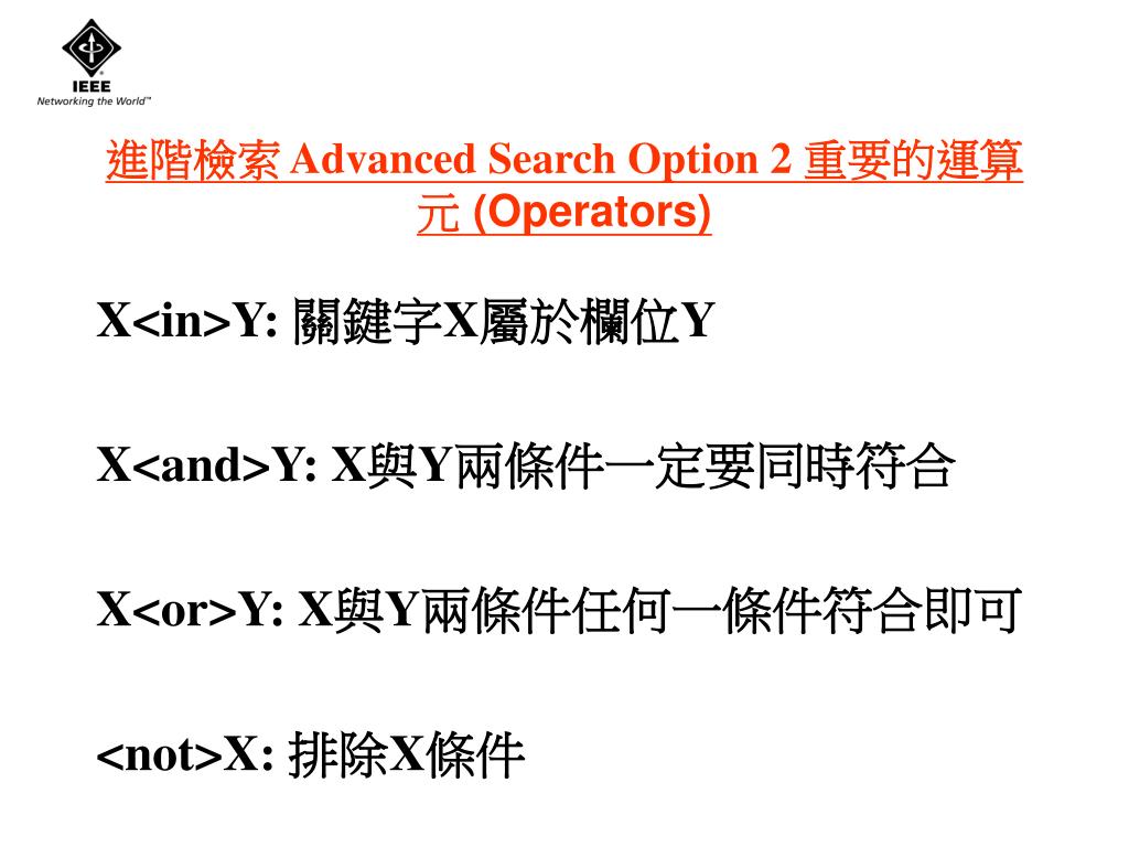 進階檢索 Advanced Search Option 2 重要的運算元 (Operators) X<in>Y: 關鍵字X屬於欄位Y X<and>Y: X與Y兩條件一定要同時符合 X<or>Y: X與Y兩條件任何一條件符合即可 <not>X: 排除X條件
