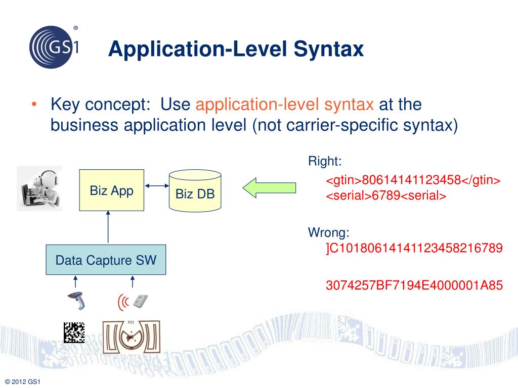 Application-Level Syntax • Key concept: Use application-level syntax at the business application level (not carrier-specific syntax) Right: <gtin>80614141123458</gtin> <serial>6789<serial> Wrong:]C10180614141123458216789 3074257BF7194E4000001A85 Biz App Biz DB Data Capture SW