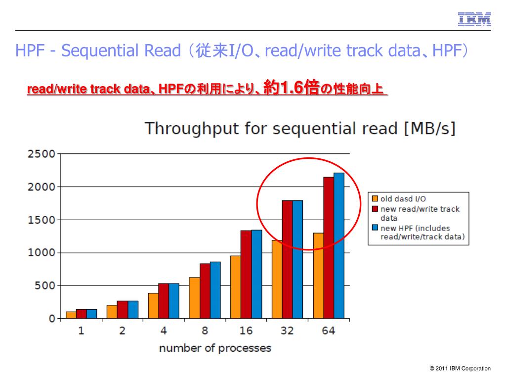 HPF - Sequential Read (従来I/O、read/write track data、HPF) read/write track data、HPFの利用により、約1.6倍の性能向上