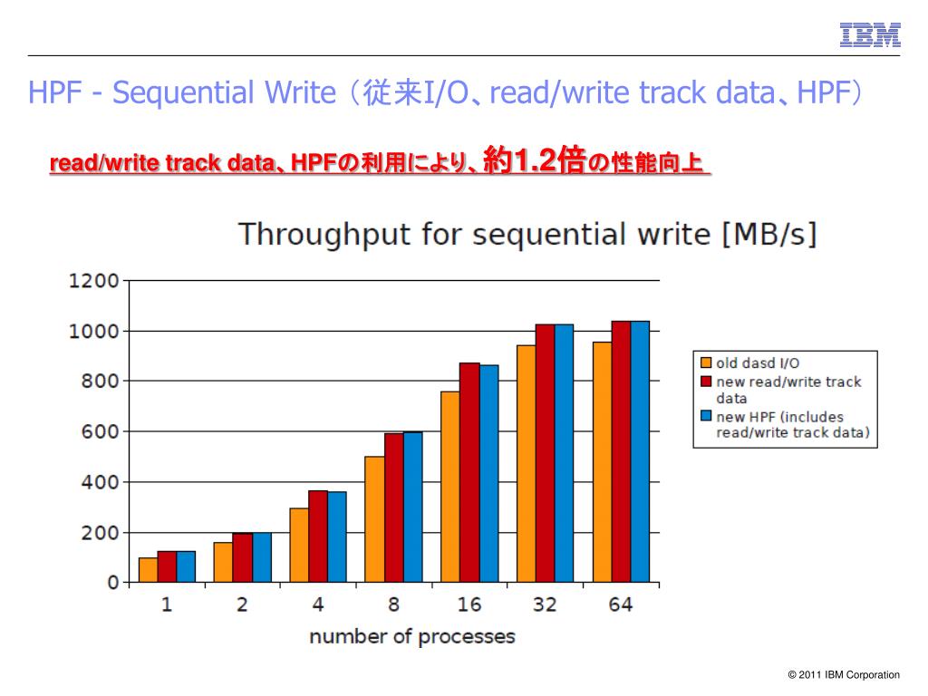 HPF - Sequential Write (従来I/O、read/write track data、HPF) read/write track data、HPFの利用により、約1.2倍の性能向上