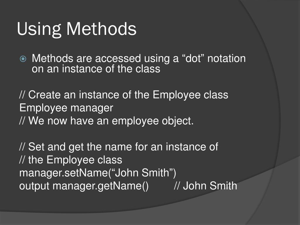 Using Methods • Methods are accessed using a “dot” notation on an instance of the class // Create an instance of the Employee class Employee manager // We now have an employee object. // Set and get the name for an instance of // the Employee class manager.setName(“John Smith”) output manager.getName() // John Smith