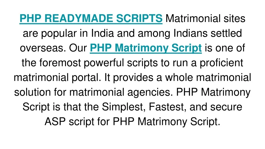 PHP READYMADE SCRIPTS Matrimonial sites are popular in India and among Indians settled overseas. Our PHP Matrimony Script is one of the foremost powerful scripts to run a proficient matrimonial portal. It provides a whole matrimonial solution for matrimonial agencies. PHP Matrimony Script is that the Simplest, Fastest, and secure ASP script for PHP Matrimony Script.
