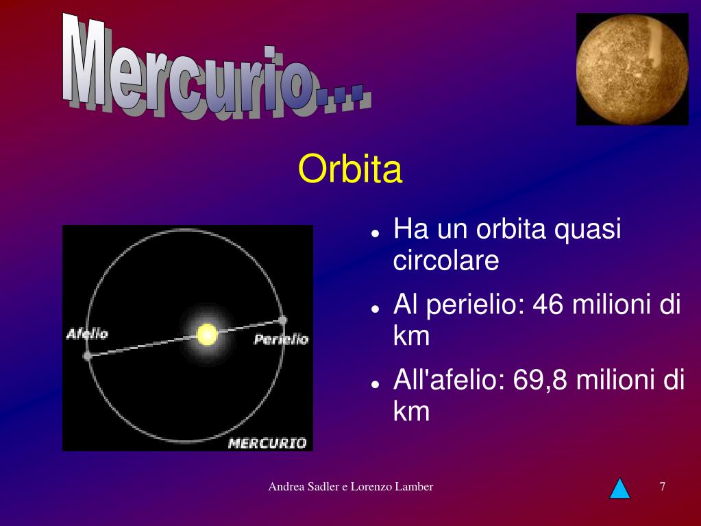 Andrea Sadler e Lorenzo Lamber Ha un orbita quasi circolare Al perielio: 46 milioni di km All'afelio: 69,8 milioni di km Mercurio... Orbita