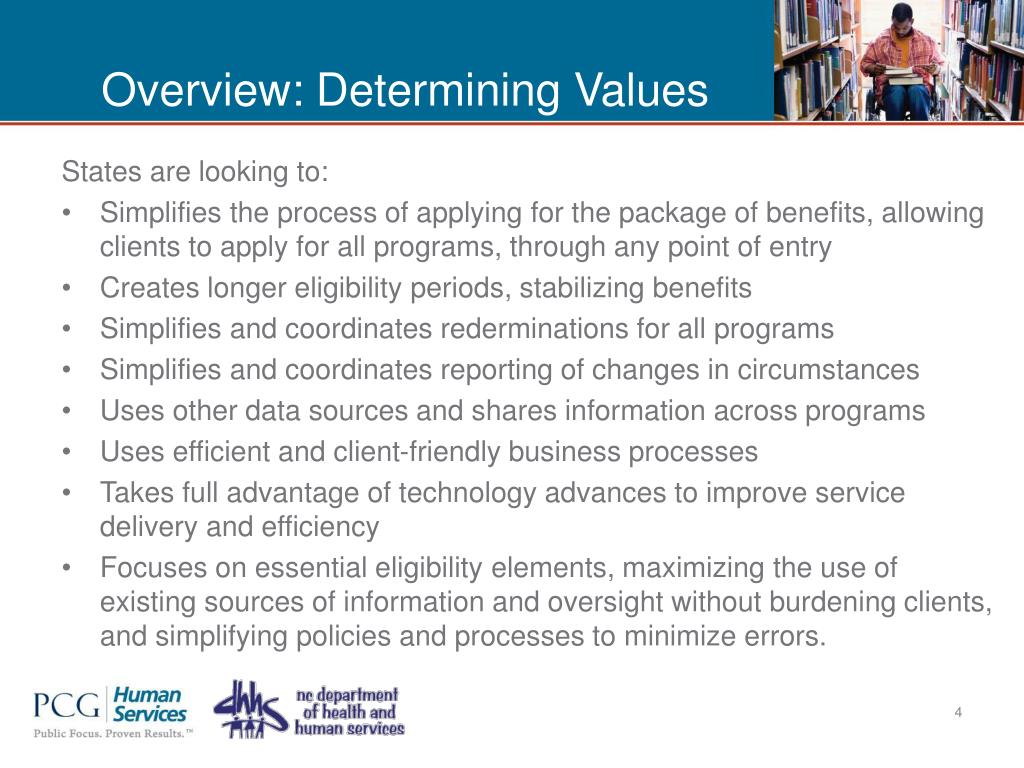 Overview: Determining Values States are looking to: • Simplifies the process of applying for the package of benefits, allowing clients to apply for all programs, through any point of entry • Creates longer eligibility periods, stabilizing benefits • Simplifies and coordinates rederminations for all programs • Simplifies and coordinates reporting of changes in circumstances • Uses other data sources and shares information across programs • Uses efficient and client-friendly business processes • Takes full advantage of technology advances to improve service delivery and efficiency • Focuses on essential eligibility elements, maximizing the use of existing sources of information and oversight without burdening clients, and simplifying policies and processes to minimize errors.