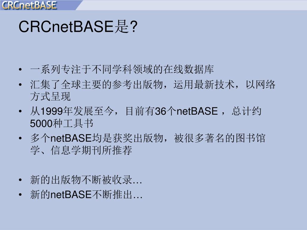 一系列专注于不同学科领域的在线数据库 汇集了全球主要的参考出版物,运用最新技术,以网络方式呈现 从1999年发展至今,目前有36个netBASE ,总计约5000种工具书 多个netBASE均是获奖出版物,被很多著名的图书馆学、信息学期刊所推荐 新的出版物不断被收录… 新的netBASE不断推出… CRCnetBASE是?