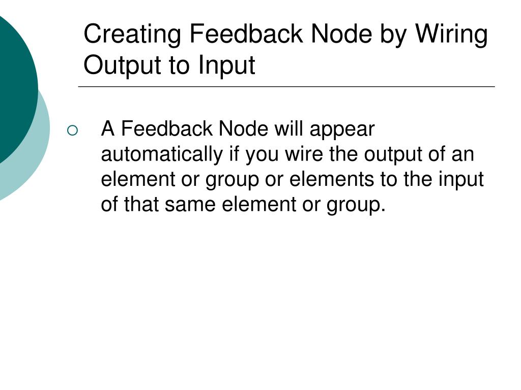 Creating Feedback Node by Wiring Output to Input • A Feedback Node will appear automatically if you wire the output of an element or group or elements to the input of that same element or group.