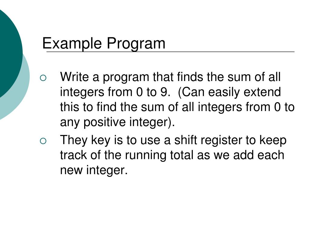 Example Program • Write a program that finds the sum of all integers from 0 to 9. (Can easily extend this to find the sum of all integers from 0 to any positive integer). • They key is to use a shift register to keep track of the running total as we add each new integer.
