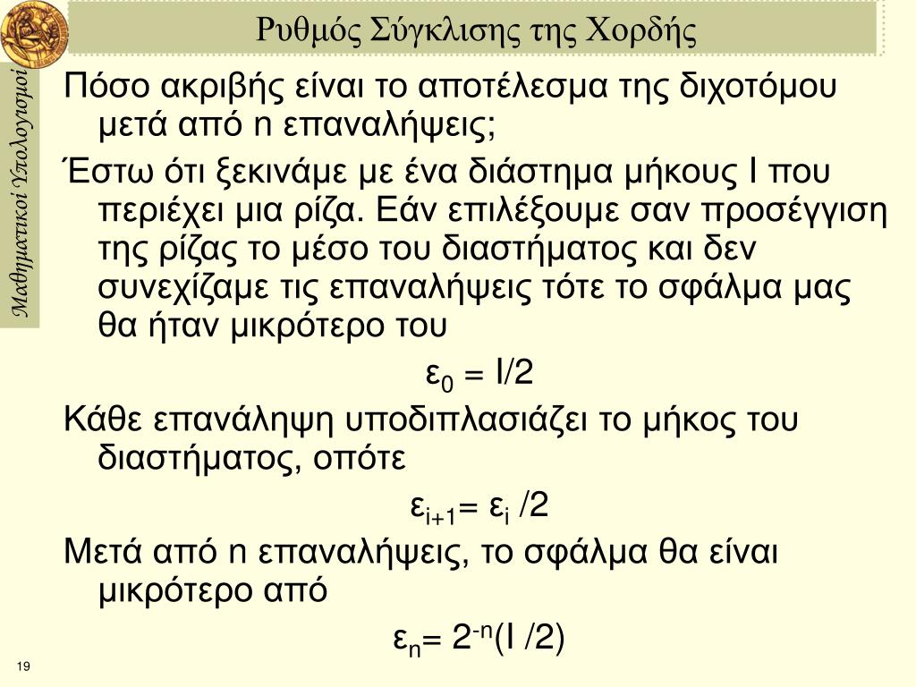 Ρυθμός Σύγκλισης της Χορδής Πόσο ακριβής είναι το αποτέλεσμα της διχοτόμου μετά από n επαναλήψεις; Έστω ότι ξεκινάμε με ένα διάστημα μήκους I που περιέχει μια ρίζα. Εάν επιλέξουμε σαν προσέγγιση της ρίζας το μέσο του διαστήματος και δεν συνεχίζαμε τις επαναλήψεις τότε το σφάλμα μας θα ήταν μικρότερο του ε0 = I/2 Κάθε επανάληψη υποδιπλασιάζει το μήκος του διαστήματος, οπότε εi+1= εi /2 Μετά από n επαναλήψεις, το σφάλμα θα είναι μικρότερο από εn= 2-n(I /2)