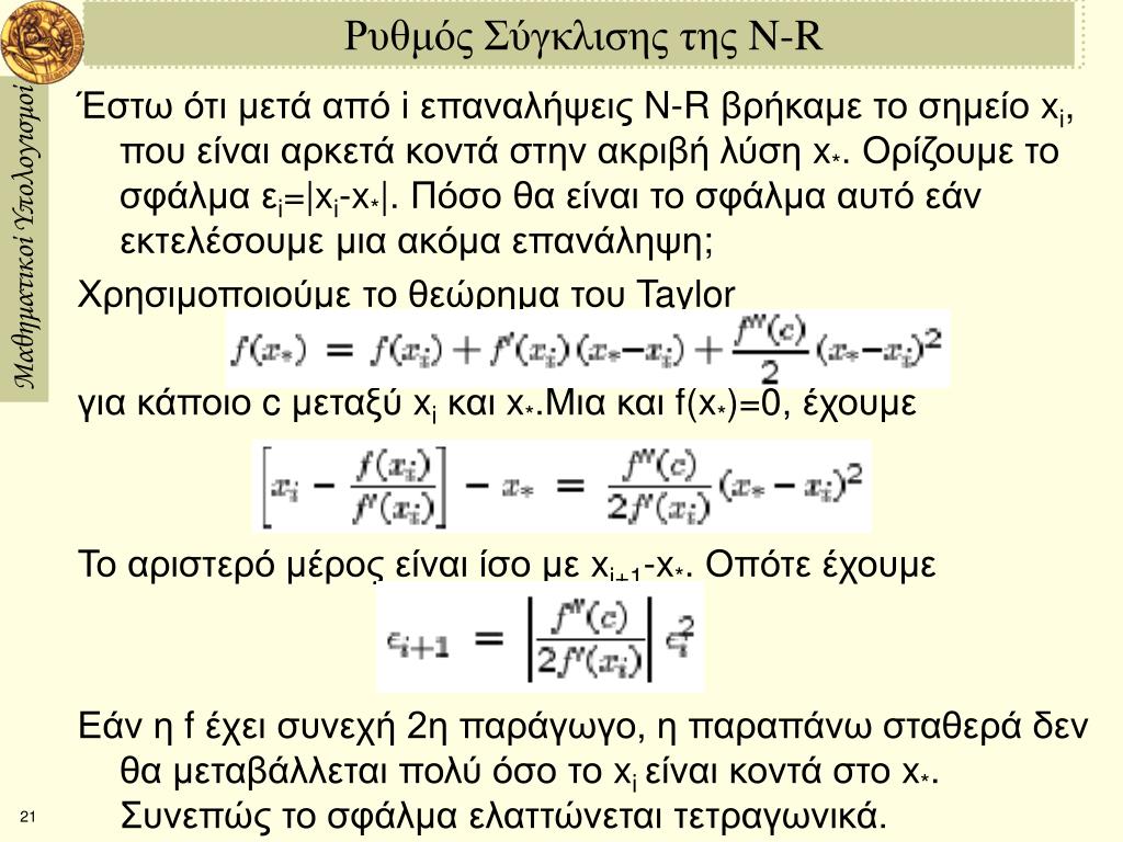 Ρυθμός Σύγκλισης της N-R Έστω ότι μετά από i επαναλήψεις N-R βρήκαμε το σημείο xi, που είναι αρκετά κοντά στην ακριβή λύση x*. Ορίζουμε το σφάλμαεi=|xi-x*|. Πόσο θα είναι το σφάλμα αυτό εάν εκτελέσουμε μια ακόμα επανάληψη; Χρησιμοποιούμε το θεώρημα του Taylor για κάποιο c μεταξύ xi και x*.Μια και f(x*)=0, έχουμε Το αριστερό μέρος είναι ίσο με xi+1-x*. Οπότε έχουμε Εάν η f έχει συνεχή 2η παράγωγο, η παραπάνω σταθερά δεν θα μεταβάλλεται πολύ όσο το xi είναι κοντά στο x*. Συνεπώς το σφάλμα ελαττώνεται τετραγωνικά.