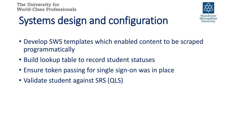 Systems design and configuration • Develop SWS templates which enabled content to be scraped programmatically • Build lookup table to record student statuses • Ensure token passing for single sign-on was in place • Validate student against SRS (QLS)