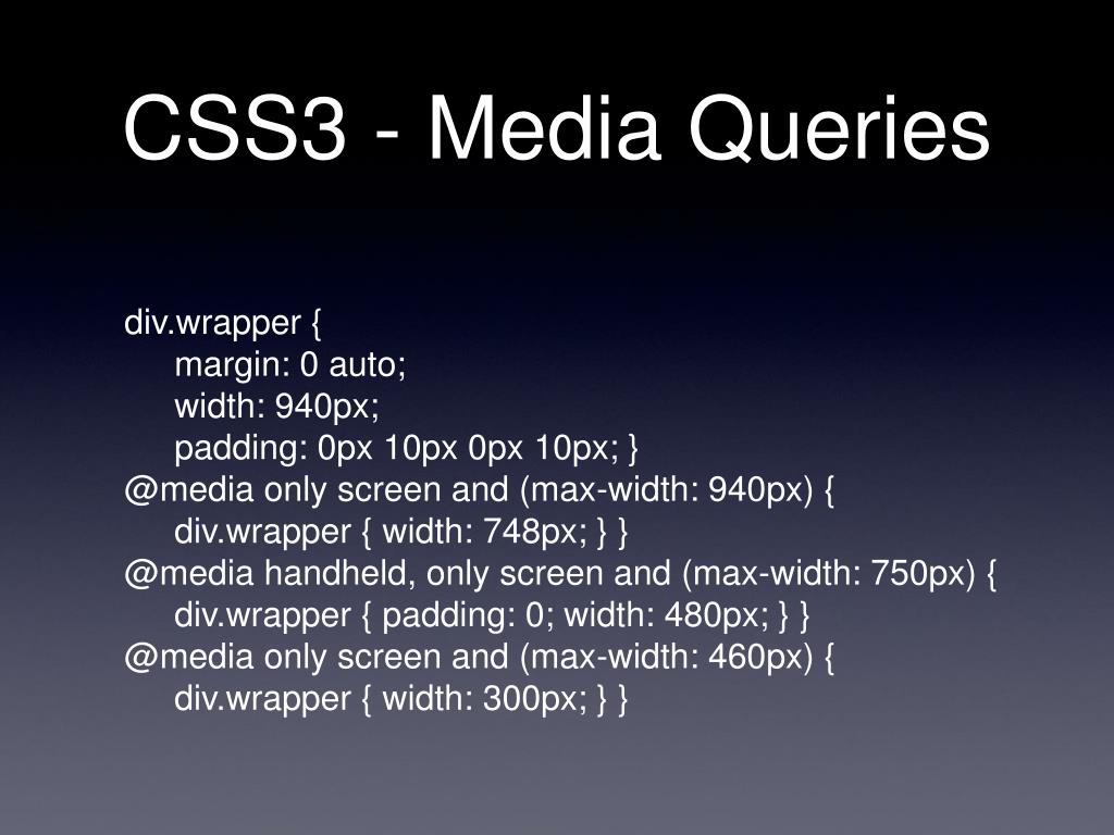 CSS3 - Media Queries div.wrapper { margin: 0 auto; width: 940px; padding: 0px 10px 0px 10px; } @media only screen and (max-width: 940px) { div.wrapper { width: 748px; } } @media handheld, only screen and (max-width: 750px) { div.wrapper { padding: 0; width: 480px; } } @media only screen and (max-width: 460px) { div.wrapper { width: 300px; } }