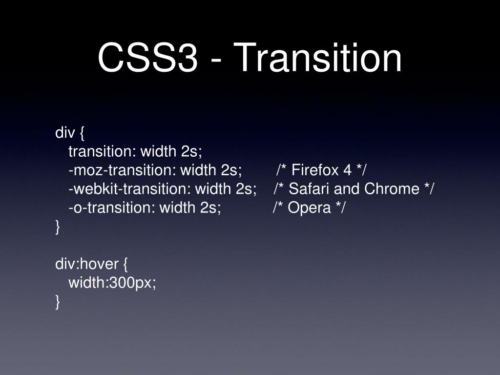 CSS3 - Transition div { transition: width 2s; -moz-transition: width 2s; /* Firefox 4 */ -webkit-transition: width 2s; /* Safari and Chrome */ -o-transition: width 2s; /* Opera */ } div:hover { width:300px; }