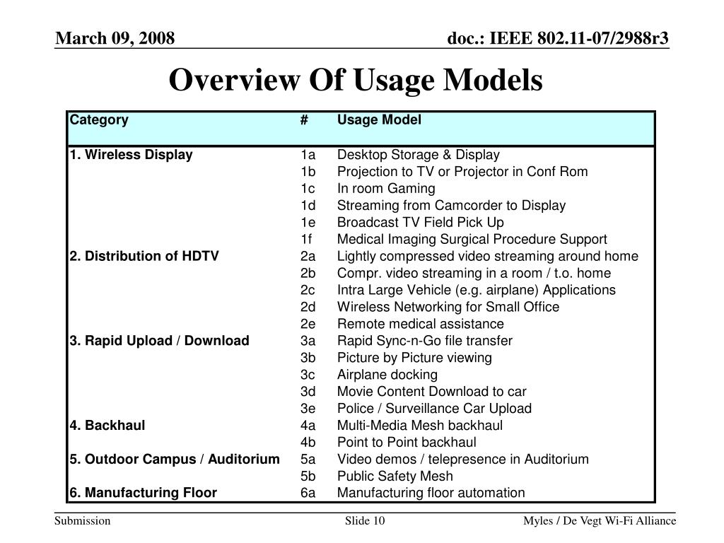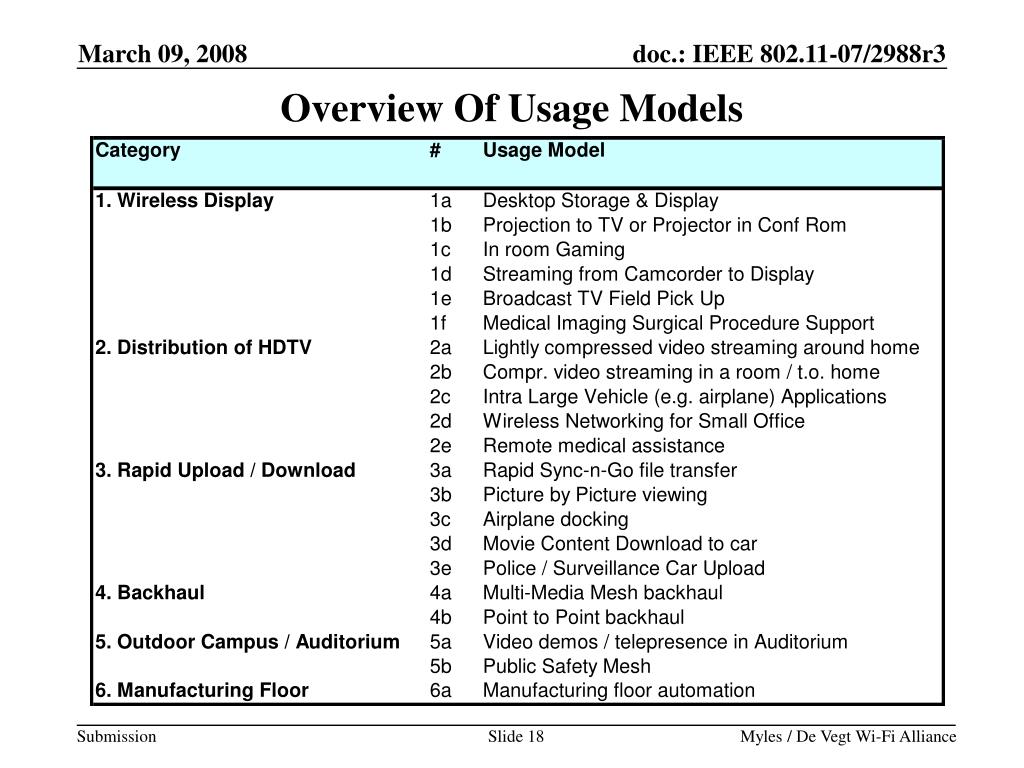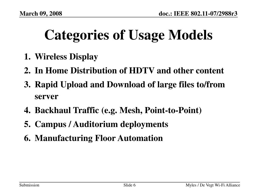 Categories of Usage Models • Wireless Display • In Home Distribution of HDTV and other content • Rapid Upload and Download of large files to/from server • Backhaul Traffic (e.g. Mesh, Point-to-Point) • Campus / Auditorium deployments • Manufacturing Floor Automation Myles / De Vegt Wi-Fi Alliance