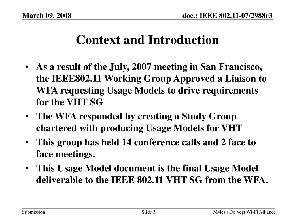 Context and Introduction • As a result of the July, 2007 meeting in San Francisco, the IEEE802.11 Working Group Approved a Liaison to WFA requesting Usage Models to drive requirements for the VHT SG • The WFA responded by creating a Study Group chartered with producing Usage Models for VHT • This group has held 14 conference calls and 2 face to face meetings. • This Usage Model document is the final Usage Model deliverable to the IEEE 802.11 VHT SG from the WFA. Myles / De Vegt Wi-Fi Alliance