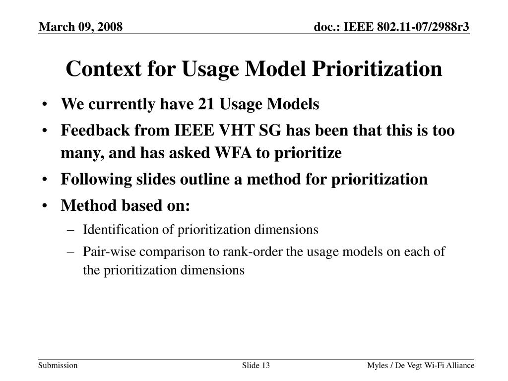 Context for Usage Model Prioritization • We currently have 21 Usage Models • Feedback from IEEE VHT SG has been that this is too many, and has asked WFA to prioritize • Following slides outline a method for prioritization • Method based on: • Identification of prioritization dimensions • Pair-wise comparison to rank-order the usage models on each of the prioritization dimensions Myles / De Vegt Wi-Fi Alliance