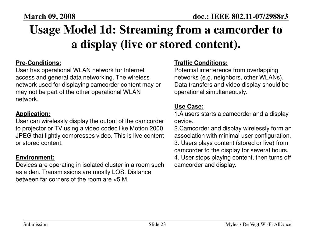 Usage Model 1c: In room gaming – video display from game machine and peer-to-peer connectivity for hand-held controllers Pre-Conditions: User has operational WLAN network for Internet access and general data networking. The wireless network used for in room gaming may or may not be part of the other operational WLAN network. Application: User can wirelessly display the output of the game console to projector or TV using a video codec like Motion 2000 JPEG that lightly compresses video. Bi-directional data goes between game console and hand-held controllers. Bi-directional controller data requirements are: 1.0 Mbps, jitter is 15 msec, delay is 15 msec, 1.0E-4 PER. Environment: Devices are operating in isolated cluster in a room such as a den. Transmissions are mostly LOS. Distance between far corners of the room are <5 M. Traffic Conditions: • Potential interference from overlapping networks (e.g. neighbors, other WLANs). Data transfers and video display should be operational simultaneously. Use Case: • Multiple users start game machine. • Game console, display, and controllers wirelessly form an association with minimal user configuration. • Users play for extended hours with no visible sign the display utilizes or controllers use wireless technology. • Users stop playing, then turns off game console. Myles / De Vegt Wi-Fi Alliance 22
