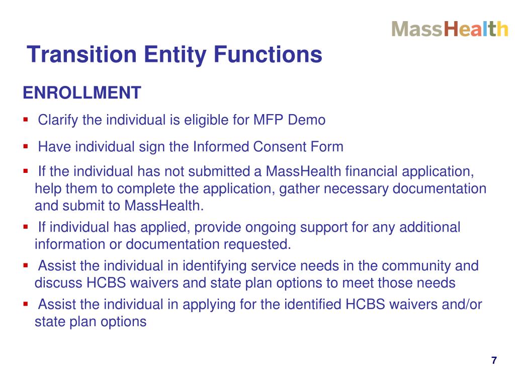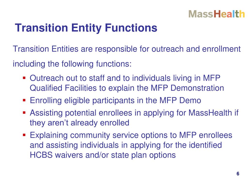 Transition Entity Functions Transition Entities are responsible for outreach and enrollment including the following functions: • Outreach out to staff and to individuals living in MFP Qualified Facilities to explain the MFP Demonstration • Enrolling eligible participants in the MFP Demo • Assisting potential enrollees in applying for MassHealth if they aren’t already enrolled • Explaining community service options to MFP enrollees and assisting individuals in applying for the identified HCBS waivers and/or state plan options