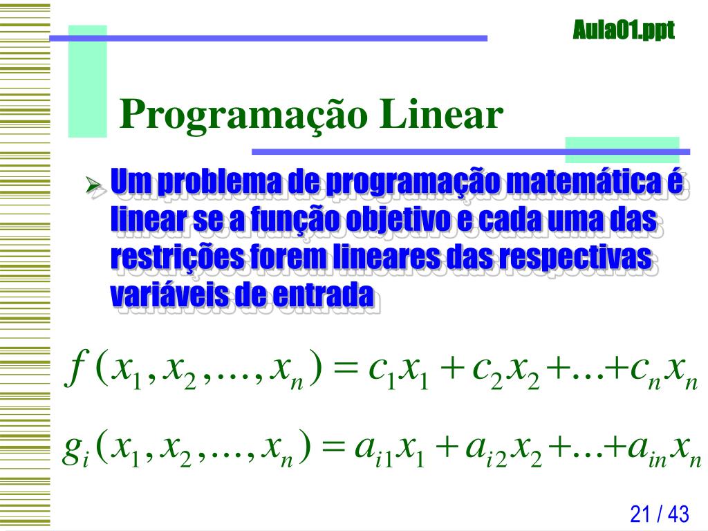 Programação Linear • Um problema de programação matemática é linear se a função objetivo e cada uma das restrições forem lineares das respectivas variáveis de entrada