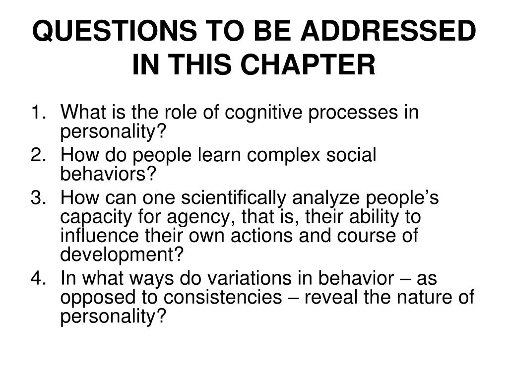 QUESTIONS TO BE ADDRESSED IN THIS CHAPTER • What is the role of cognitive processes in personality? • How do people learn complex social behaviors? • How can one scientifically analyze people’s capacity for agency, that is, their ability to influence their own actions and course of development? • In what ways do variations in behavior – as opposed to consistencies – reveal the nature of personality?