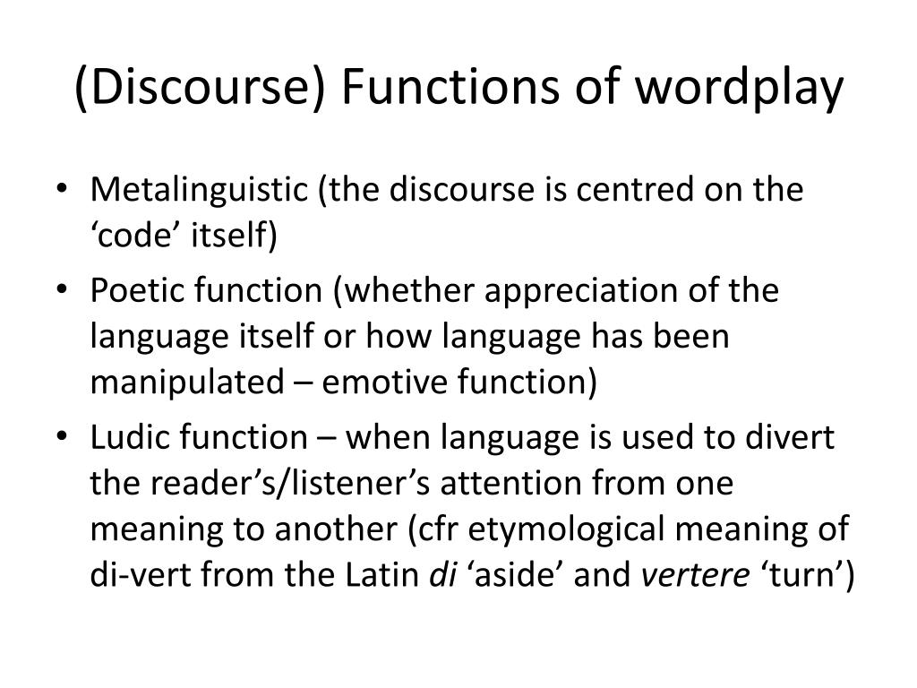 (Discourse) Functions of wordplay • Metalinguistic (the discourse is centred on the ‘code’ itself) • Poetic function (whether appreciation of the language itself or how language has been manipulated – emotive function) • Ludic function – when language is used to divert the reader’s/listener’s attention from one meaning to another (cfr etymological meaning of di-vert from the Latin di ‘aside’ and vertere‘turn’)
