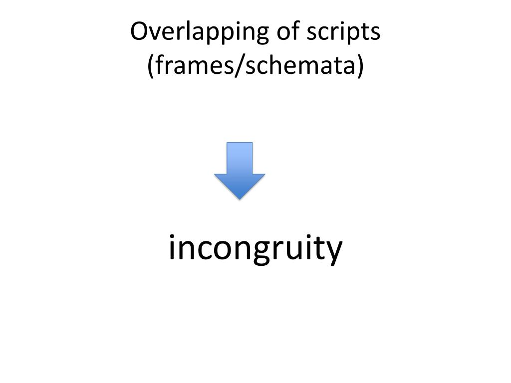 Incongruity and scripts • This incongruity can best be analyzed as an unexpected switch from one script (schema/frame) to another initially incompatible one. Thus “Mexican weather forecast: Chilly today and hot tamale” initially evokes a weather report script but then shatters it at the final word tamale. This surprise reversal then also forces reinterpretation of the word chilly as chili to fit the new script. The simultaneous availability of two scripts for a single phrase causes the dual perception Koestler (1964) dubbed “bisociation,” which yields subsequent laughter. • N. R. Norrick, “Repetition in Canned Jokes and Spontaneous Conversational Joking”, Humor, vol. 6, n° 4, 1993, pp. 392