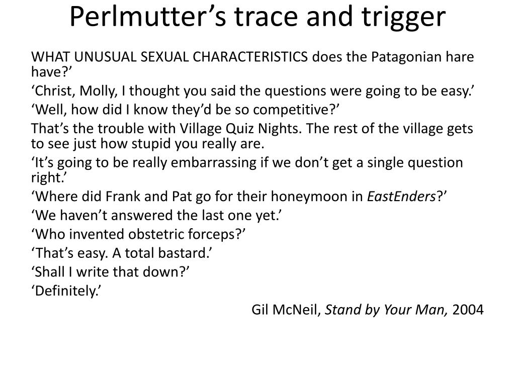 Perlmutter’s trace and trigger WHAT UNUSUAL SEXUAL CHARACTERISTICS does the Patagonian hare have?’ ‘Christ, Molly, I thought you said the questions were going to be easy.’ ‘Well, how did I know they’d be so competitive?’ That’s the trouble with Village Quiz Nights. The rest of the village gets to see just how stupid you really are. ‘It’s going to be really embarrassing if we don’t get a single question right.’ ‘Where did Frank and Pat go for their honeymoon in EastEnders?’ ‘We haven’t answered the last one yet.’ ‘Who invented obstetric forceps?’ ‘That’s easy. A total bastard.’ ‘Shall I write that down?’ ‘Definitely.’ Gil McNeil, Stand by Your Man, 2004
