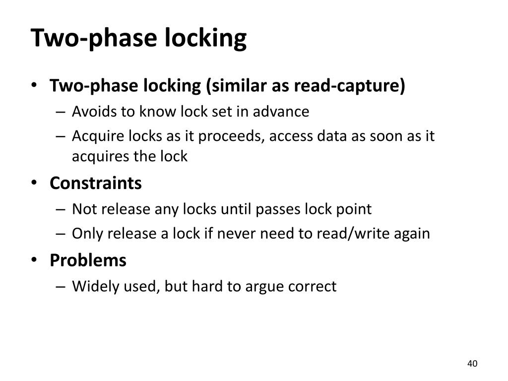 Two-phase locking • Two-phase locking (similar as read-capture) • Avoids to know lock set in advance • Acquire locks as it proceeds, access data as soon as it acquires the lock • Constraints • Not release any locks until passes lock point • Only release a lock if never need to read/write again • Problems • Widely used, but hard to argue correct